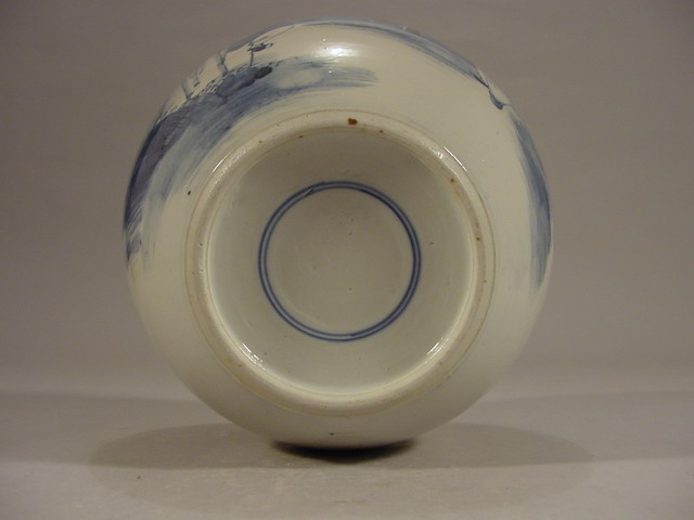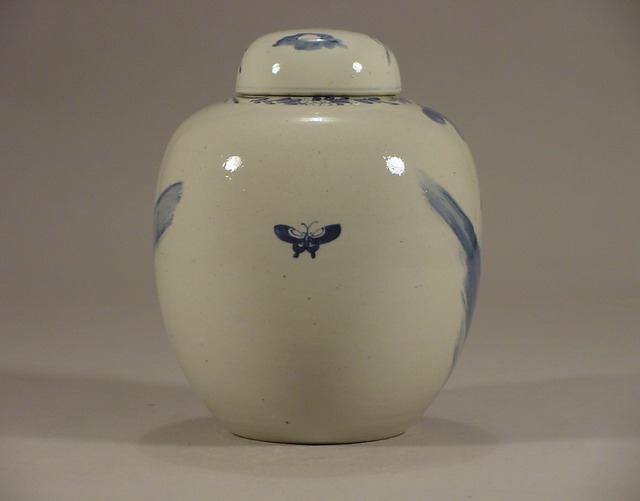 rings in underglaze blue. The entire jar is covered with a soft clear glaze. |