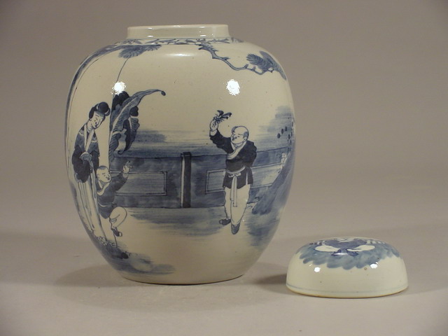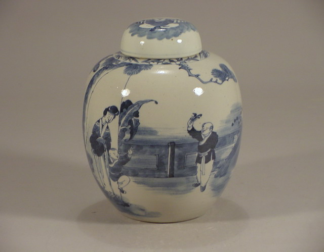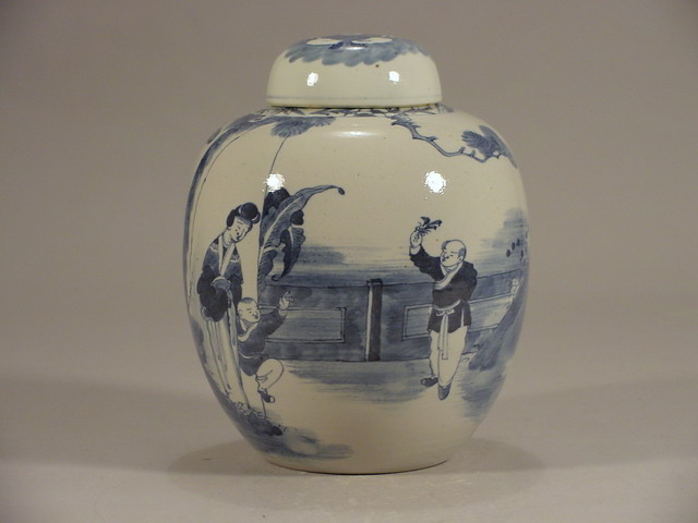 ginger jar with domed lid painted with a family scene in a walled garden of a