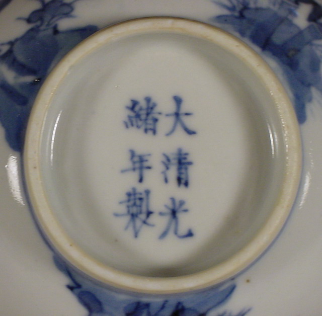 written in kaishu script in underglaze blue is the mark and period of the Guangxu