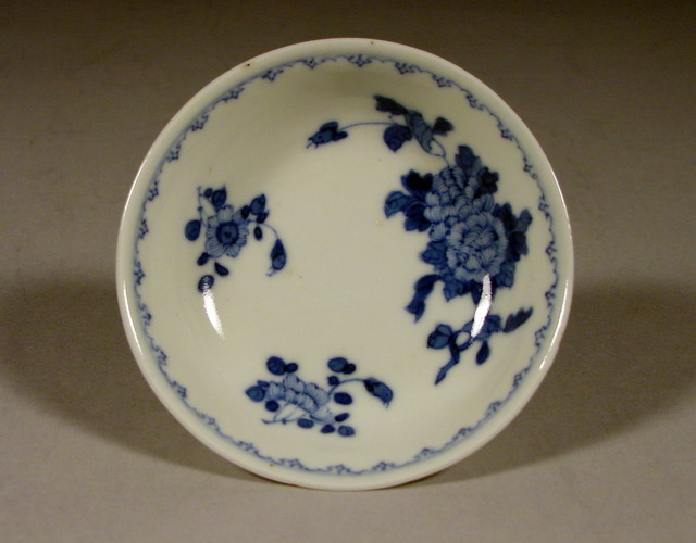 A fine blue and white saucer painted simply with three floral bouquets consisting of peonies and