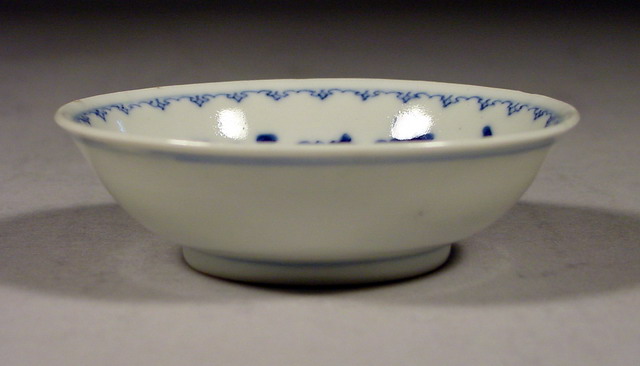 periwinkles delicately rendered in varying tones of blue pigment all encircled by a spearpoint border with a single line border just below the rim. The exterior is decorated