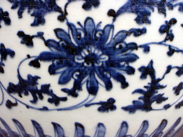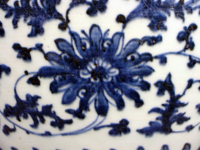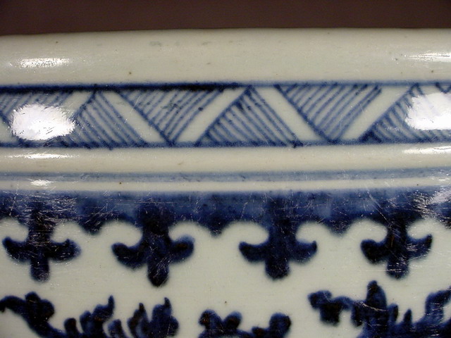raised rib decorated with scrolling blossoming lotus between a pendant spear point border and a stylized
