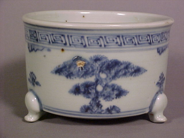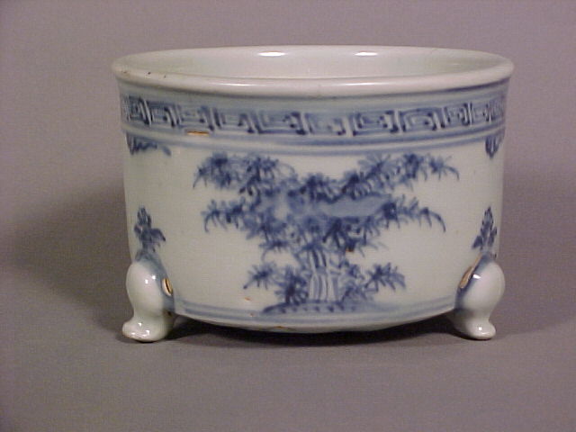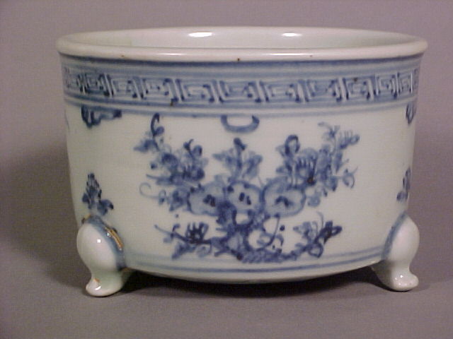 cylindrical form, the sides rising to a lipped rim and raised on three short