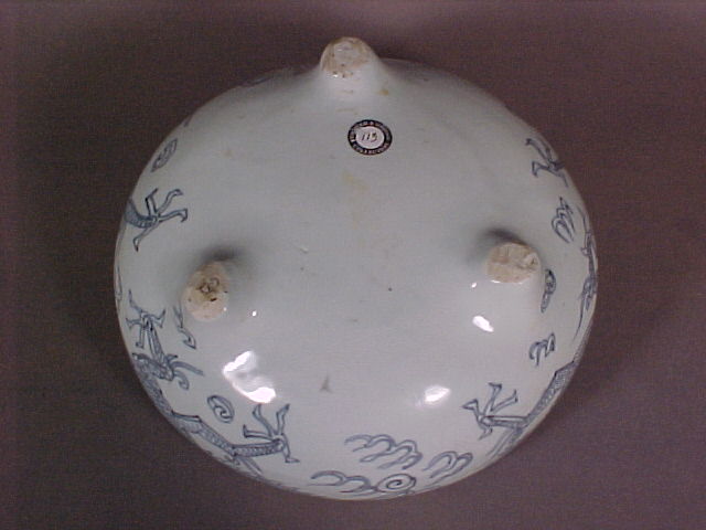 three stubby feet rising to an in-turned rim. The body is decorated in