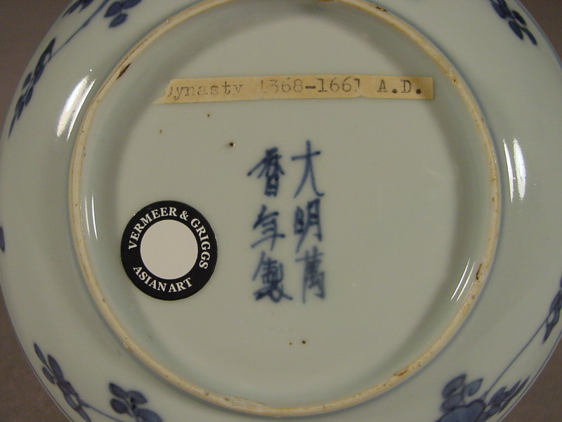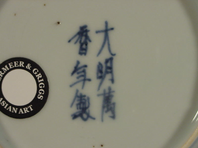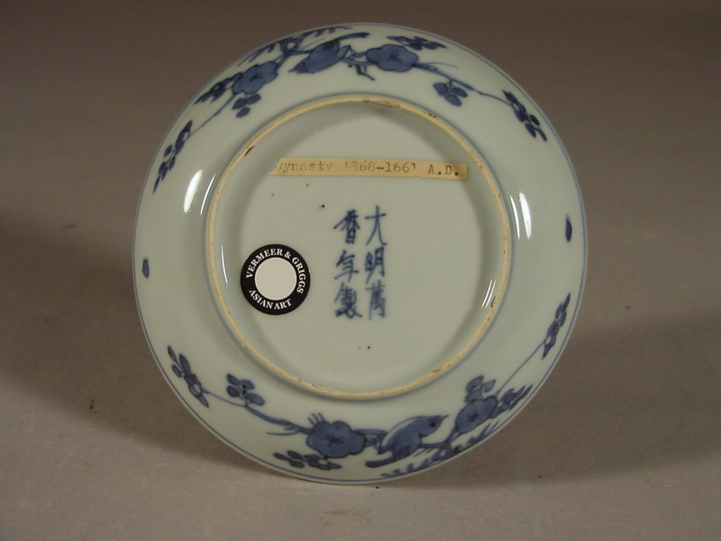 bird perched upon them in opposing position encircled by double line borders. On the base is painted the six character kaishu mark and period of the 萬曆 帝