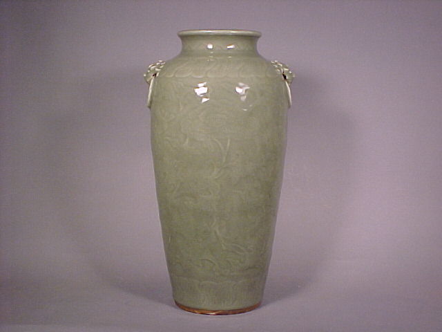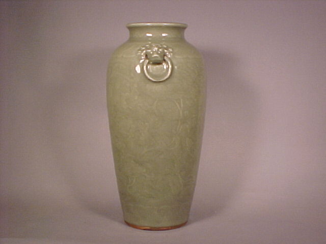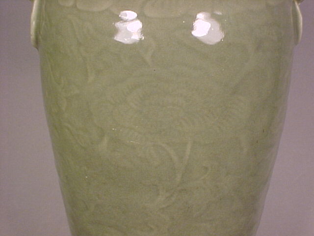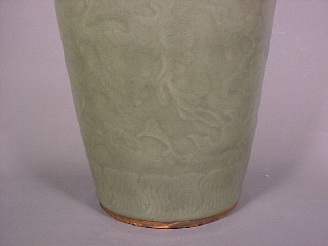 rich translucent olive toned celadon glaze and the recessed base is unglazed and