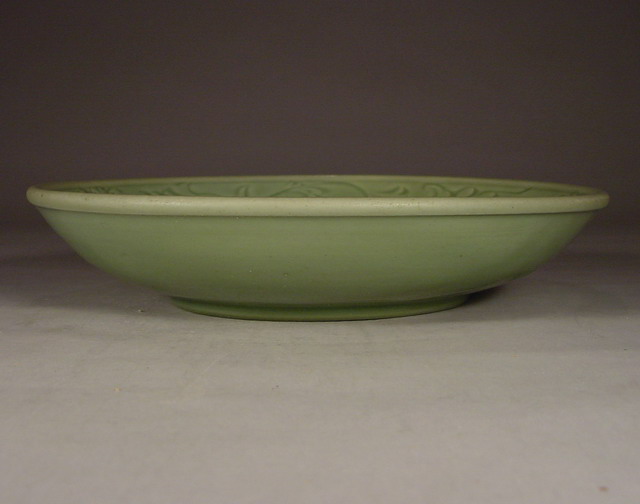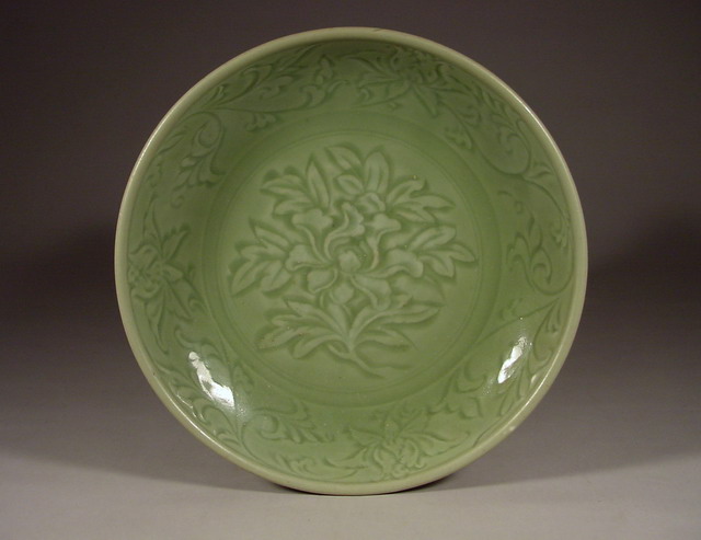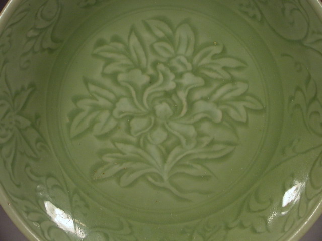 medallion floral spray of stylized peony blossoms in the center. The cavetto carved