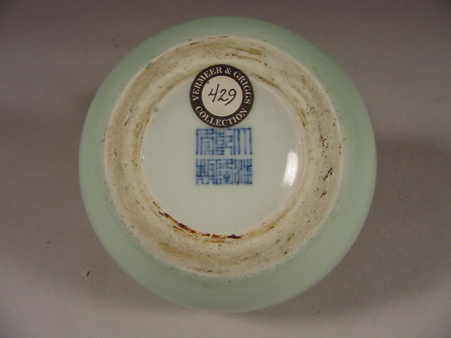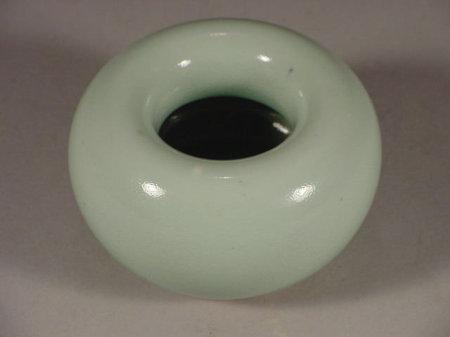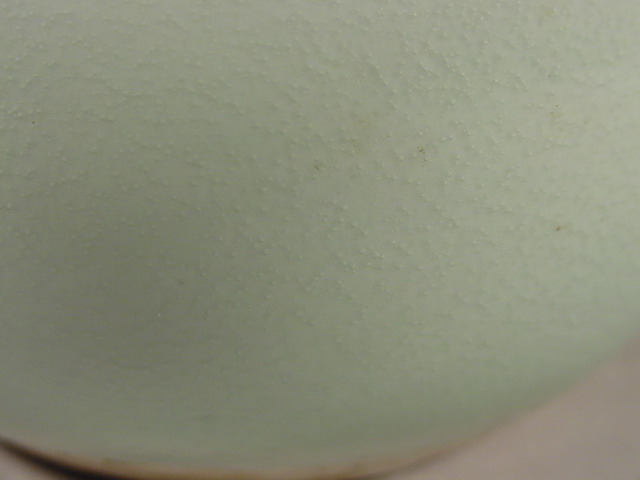 an orange peeled sea foam celadon bubble suffused glaze stopping in a line above the foot