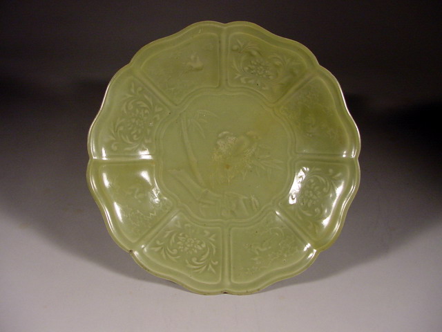 octagonal lobed Zhejiang Longquan celadon dish, the cavetto decorated