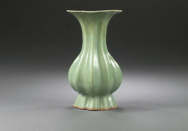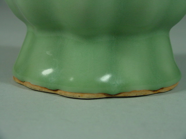 celadon that covered a Longquan mallet vase. The pear-shaped fluted body sits atop a high fluted foot-rim, the interior