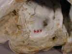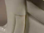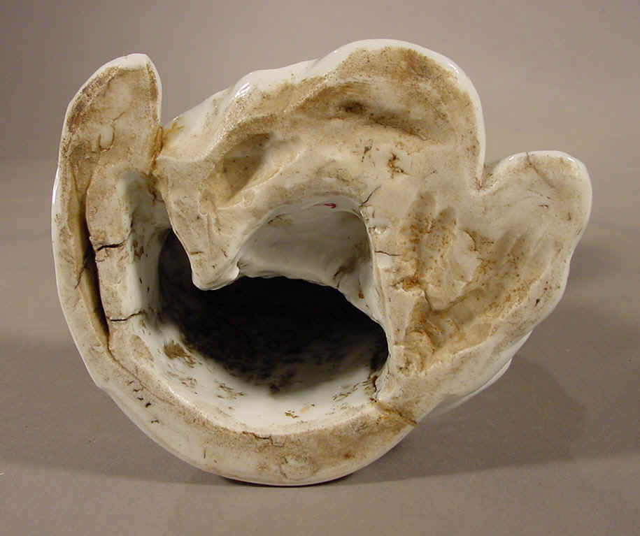 face lowered with a benign expression below an elaborate chignon mounted with a