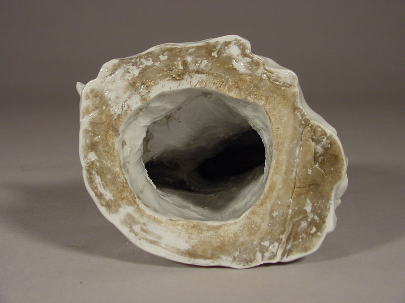 below an elaborate chignon mounted with a tiara all under a grayed white toned glaze. |