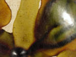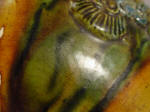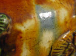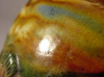 amber glaze vibrantly splashed with cream, blue, ochre and green, the