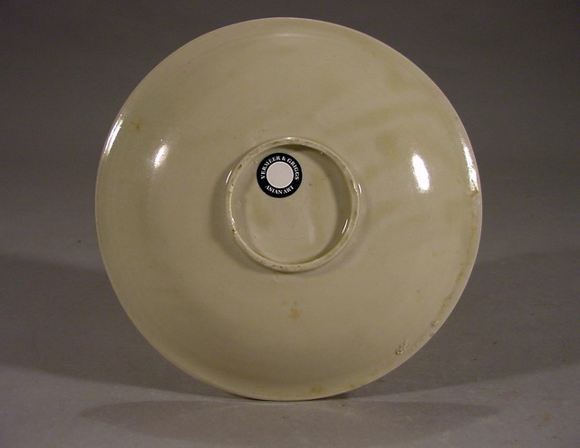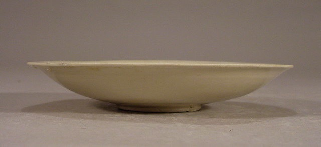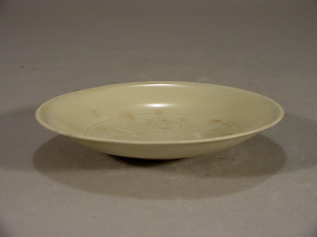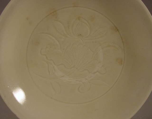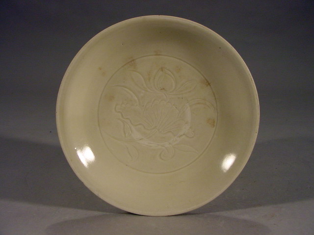 raised on a short ring foot decorated with incised design of lotus flowers covered entirely in a creamy ivory