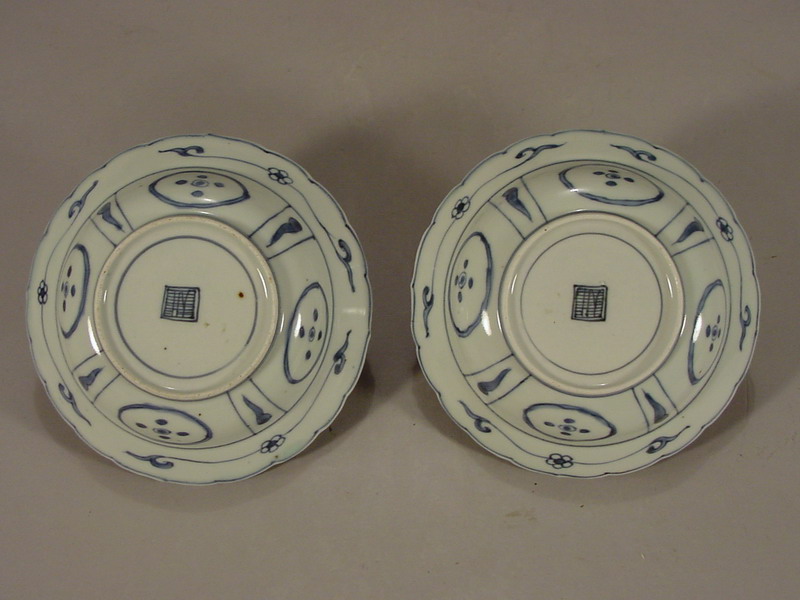 barbed and scalloped edge painted in brilliant underglaze blue. The pair are decorated