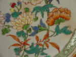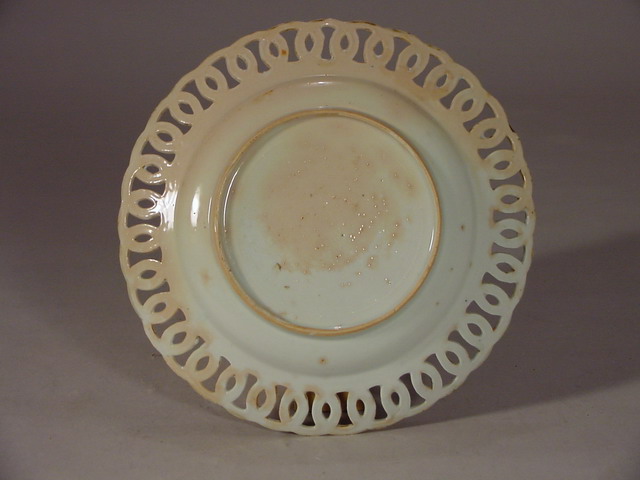 rim is made up of interlocking rings painted in a faux marbleized finish. The reverse is undecorated and the glaze discolored in areas. This interlocking ring plate design was first