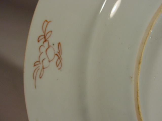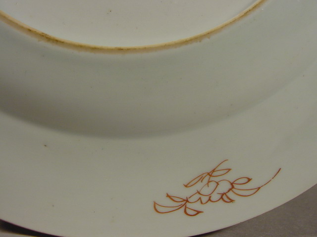 palette. Extending from the wide rim onto the cavetto a cloud collar border detailed in brown sepia enamels of a swirled diaper ground with further