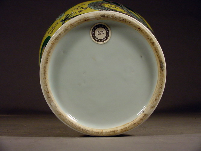 lemon-yellow enameled ground. The interior and base are covered in a clear glaze. 清代 Qing Dynasty, 康熙 Kangxi /早雍正 early Yongzheng period, circa 1722 Height: 17 3/4" (45.1cm) Condition: Excellent Provenance: Vermeer & Griggs Collection No. 320 Please refer to item #FJ-300-320 when inquiring. |