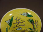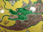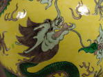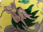 above a high stepped foot. Painted in the famille jaune palette with three ferocious 'Imperial' five clawed writhing dragons