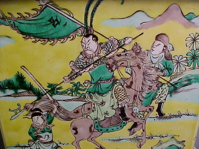 with under-trays, decorated in the famille verte (Kangxi wucai) palette on a lemon yellow