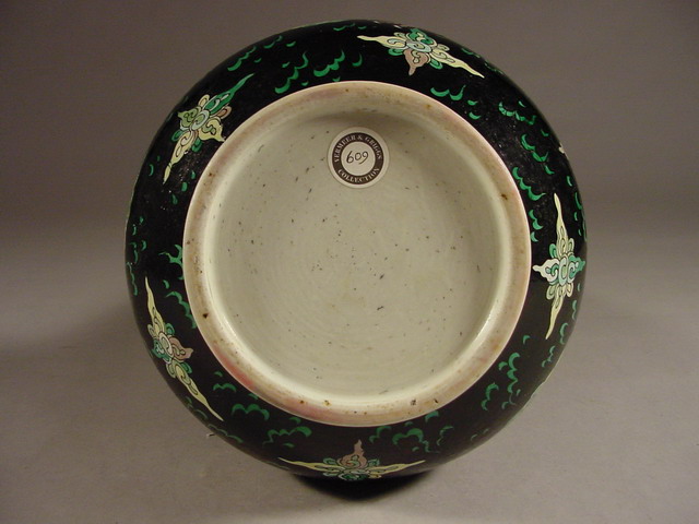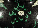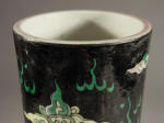 been previously incised into the paste. The base is covered in a clear glaze. Famille noire items fell out of favor after the Kangxi period and