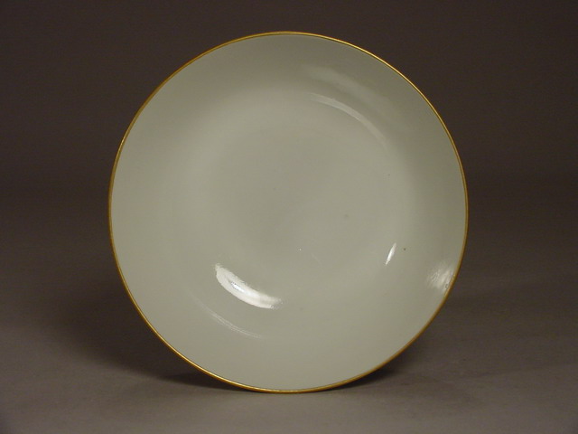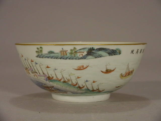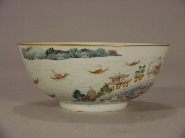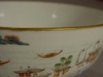 bowl with well rounded sides finely painted with a harbor scene depicting the