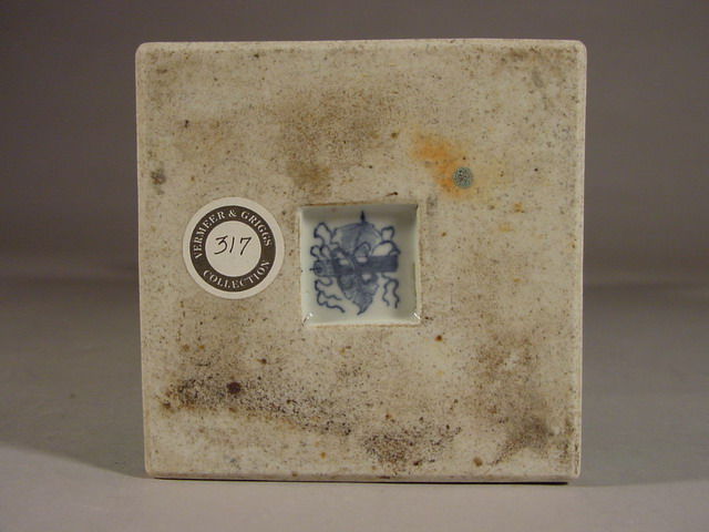 ground applied to the biscuit and covered with a clear glaze. On the shoulder of the vase at each corner