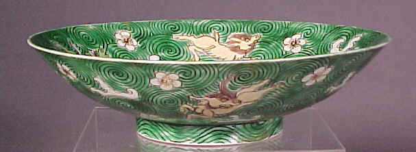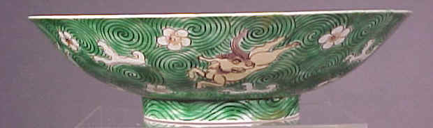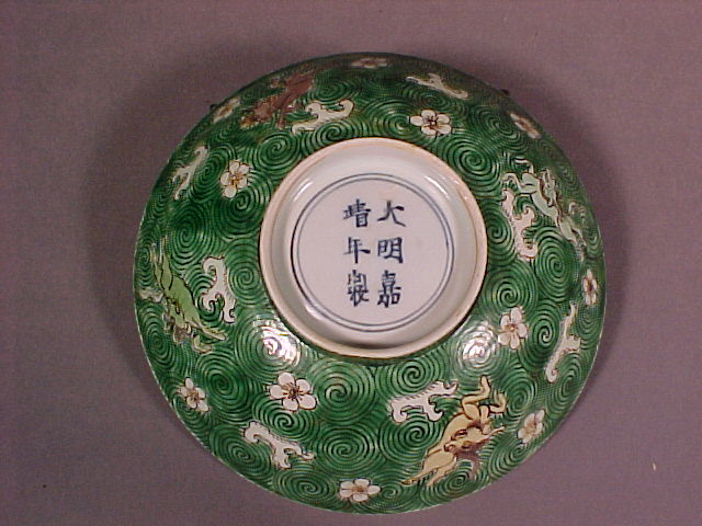 An extremely rare famille verte Ming styled shallow bowl raised on a