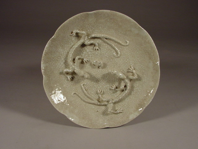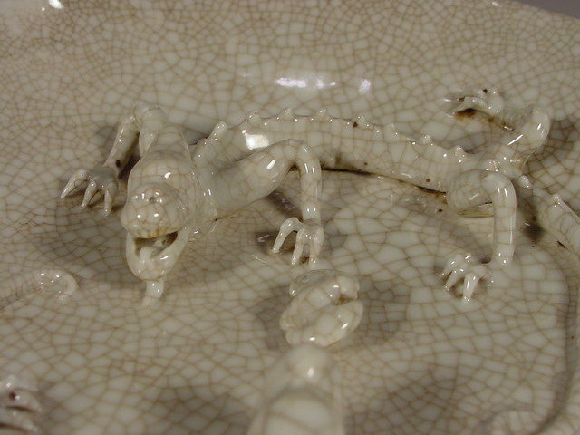 probably Qianlong period. 清代 Qing dynasty, 乾隆 Qianlong Period (1736-1795) Height: 1 1/2" (3.8cm) Diameter: 10" (25.4cm) Provenance: Vermeer & Griggs Collection No. 406 Condition: Excellent, one claw broken off on rear foot of one qilong. Please refer to item #GU-307 when inquiring. |