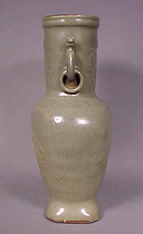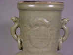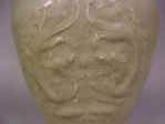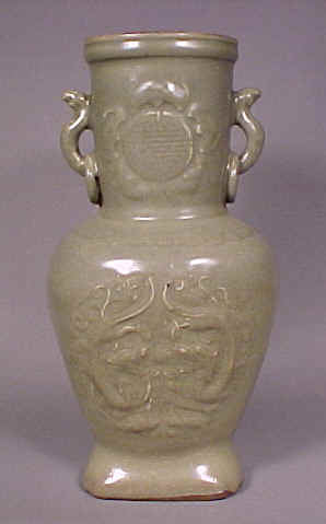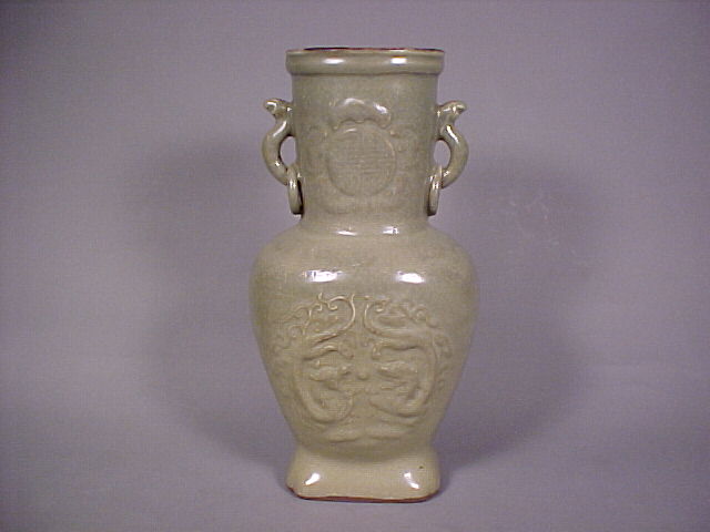 bifurcated chilongs centered on the body which rests on a splayed foot. The vase is covered in a thick olive toned celadon guan-type glaze. The