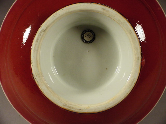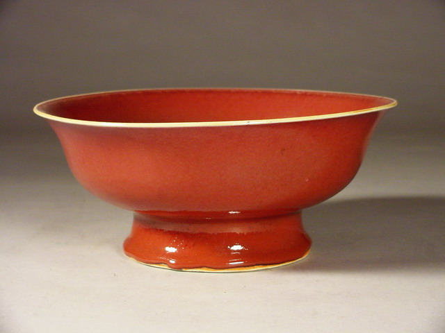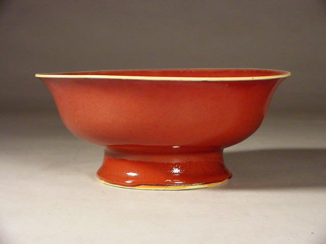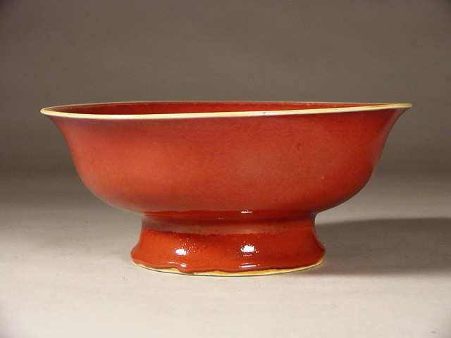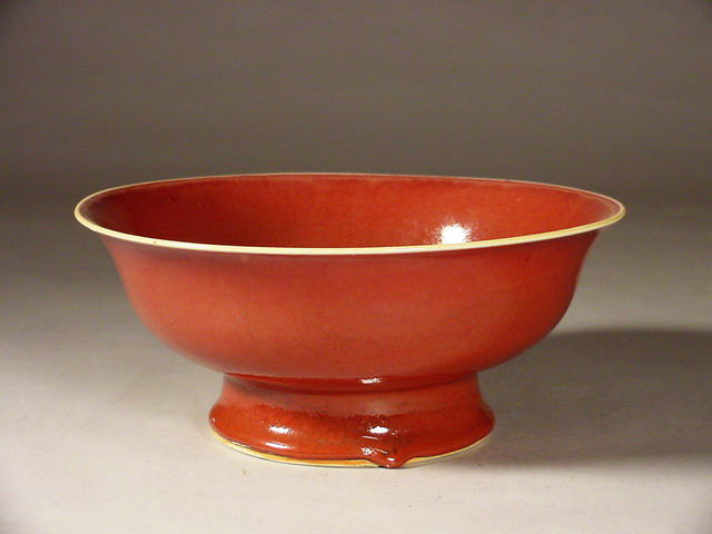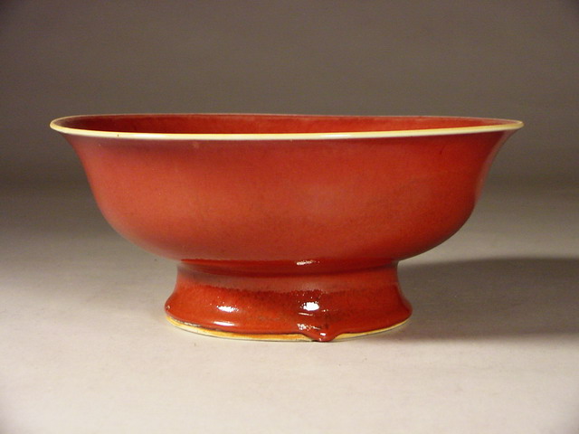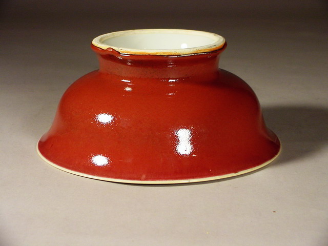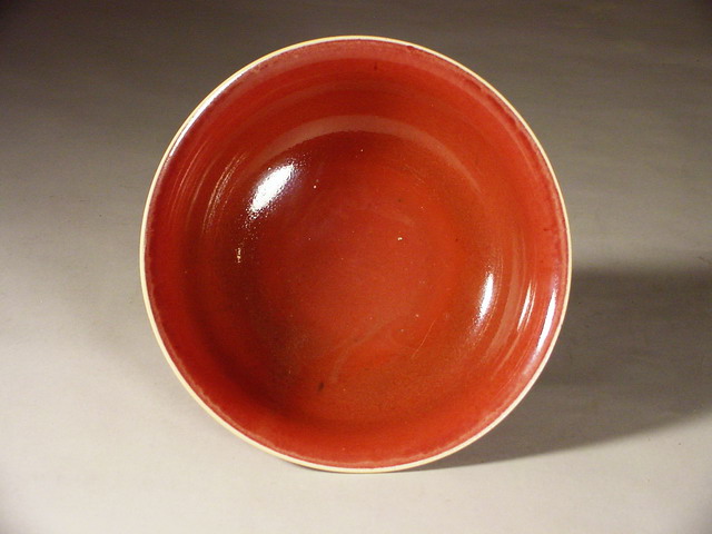 edge exposing the buff tone body. The thick copper red glaze drains from