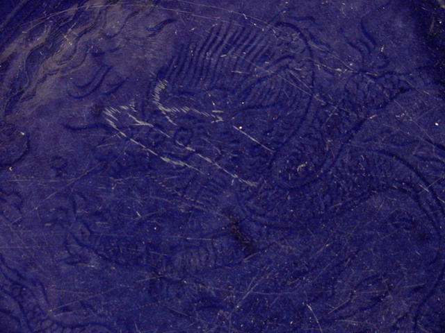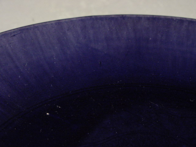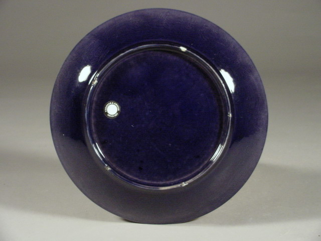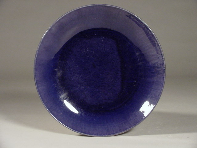 in glaze shows five spur marks where the dish rested on supports during firing. |