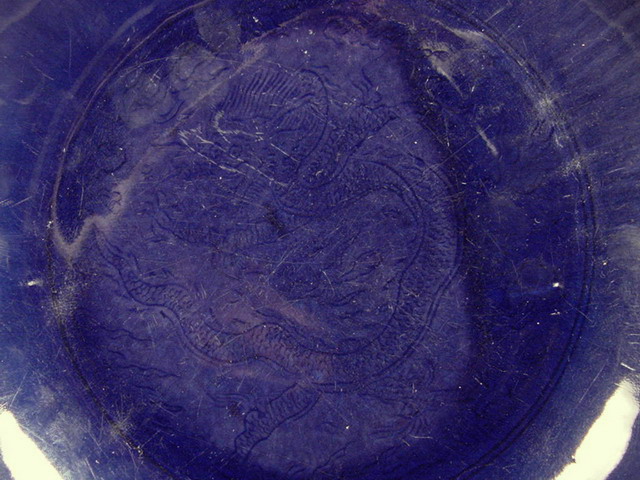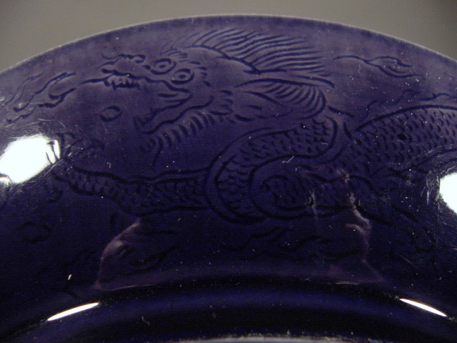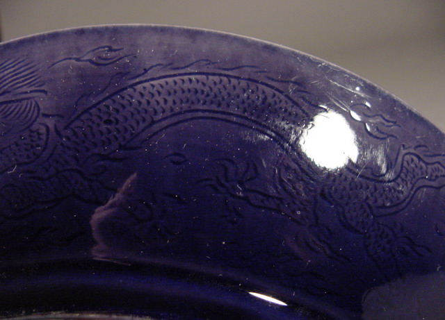 clouds are incised beneath the glaze. In the center of the dish is a single four clawed Ming-style dragon