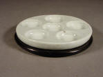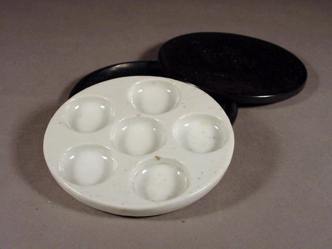 (depressions) encircling a sixth in the center to hold various colored paints. On the base are spur marks showing the palette was probably dipped in glaze and