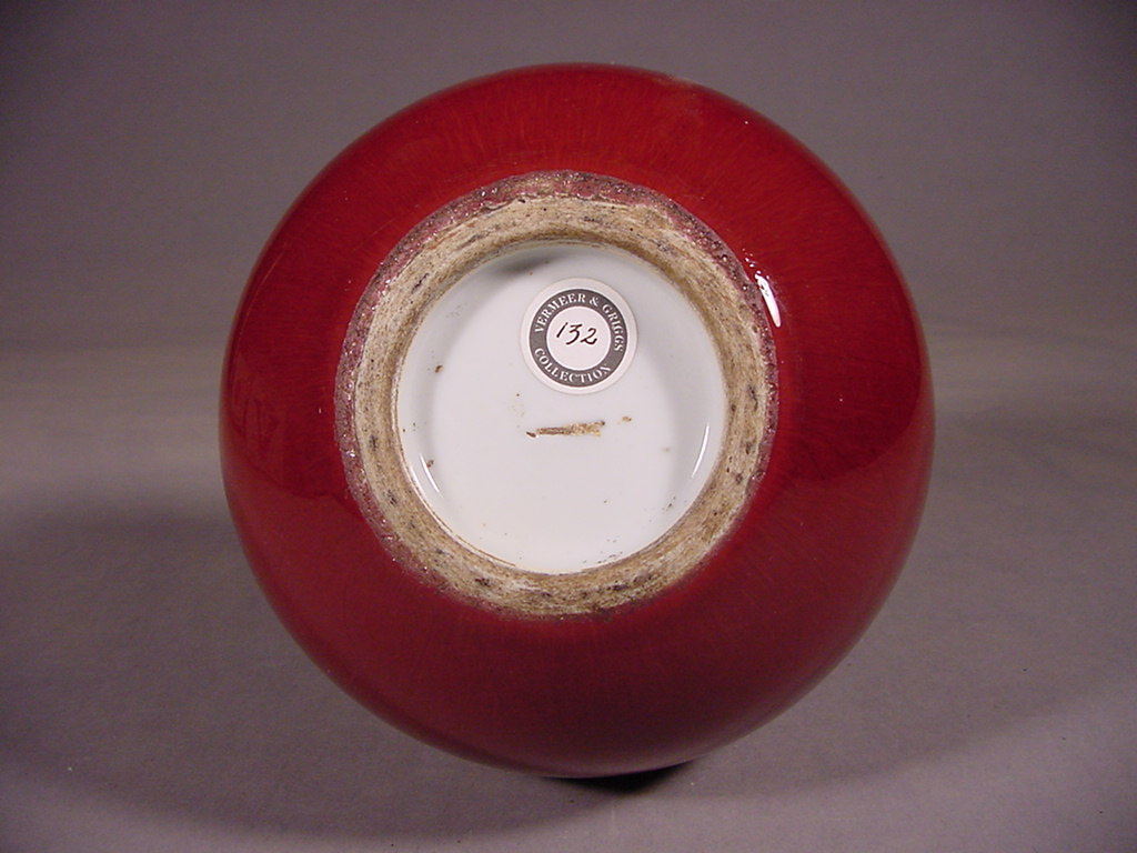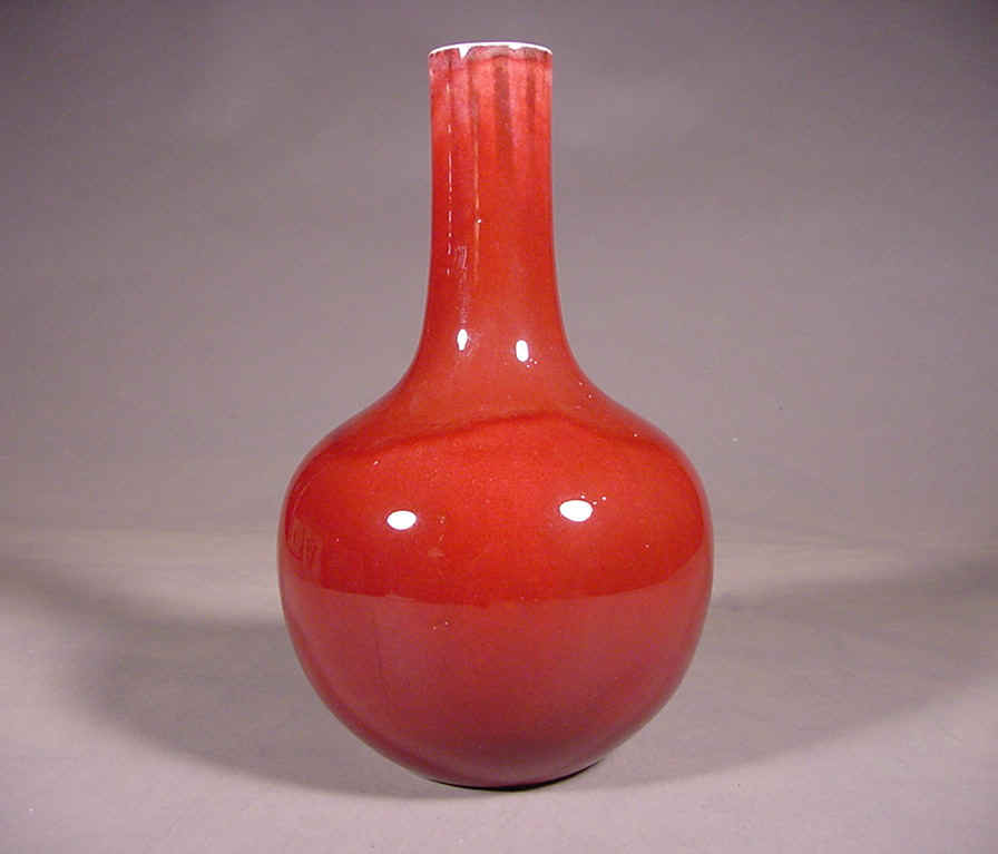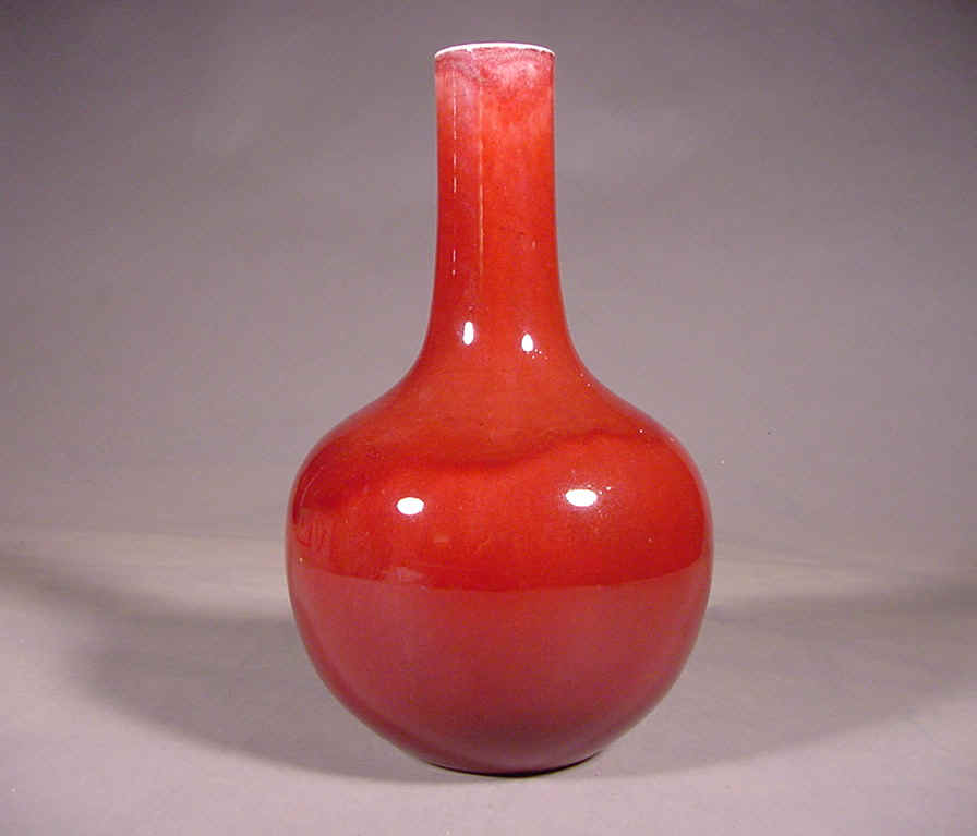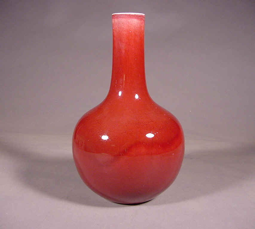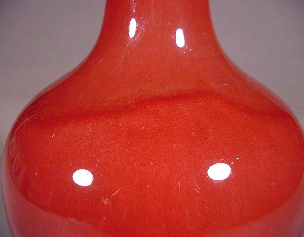 rich transparent raspberry glaze with large craquelure thinning from the neck