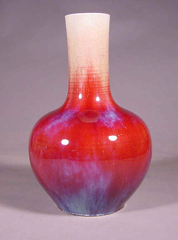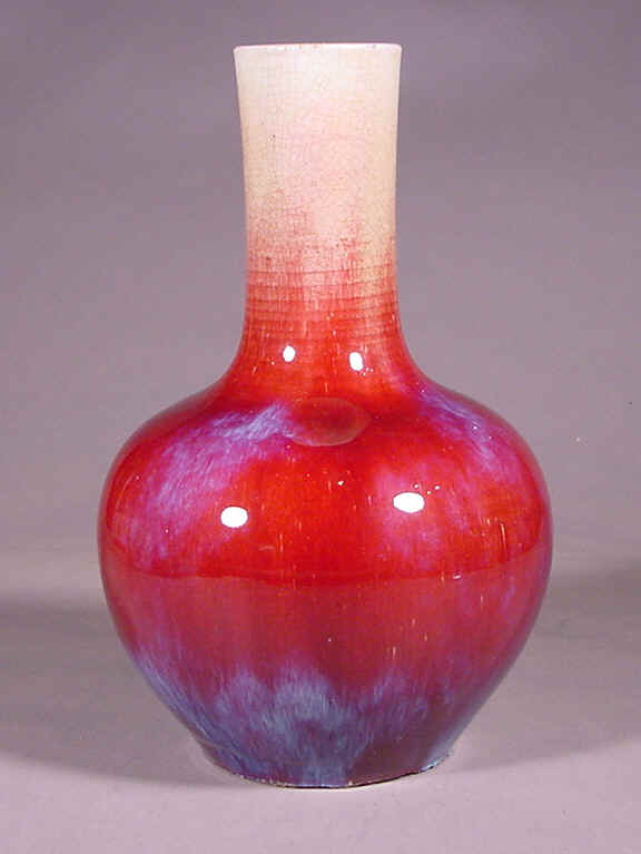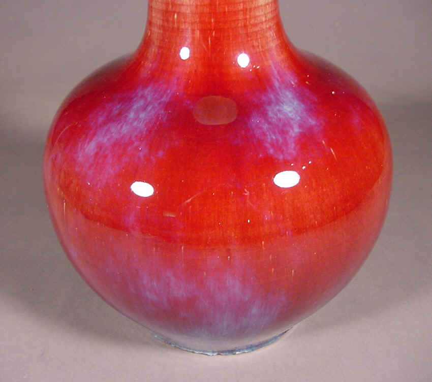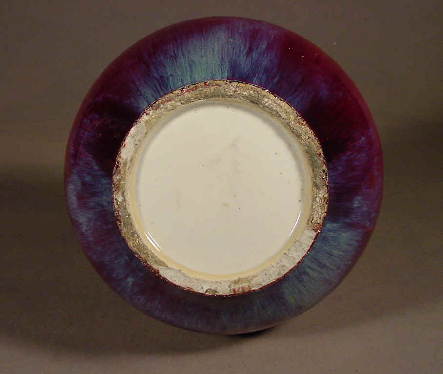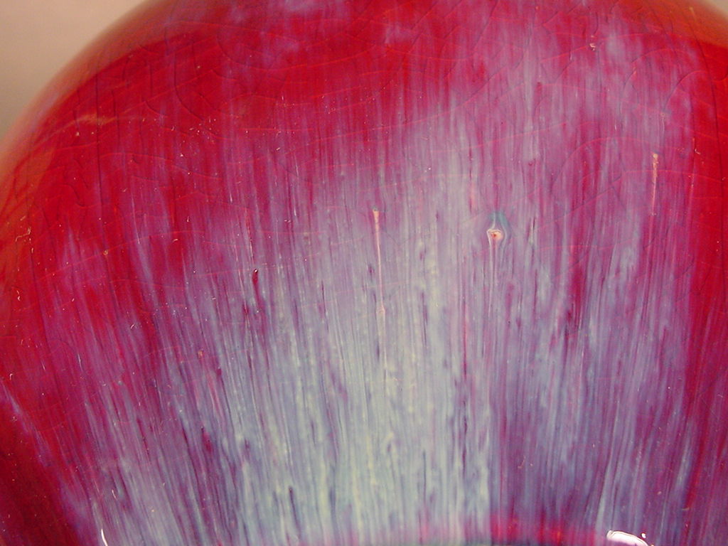 rich raspberry flambé glaze streaked with patches of blue. The glaze has