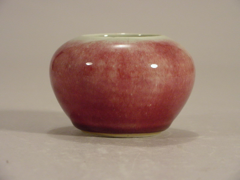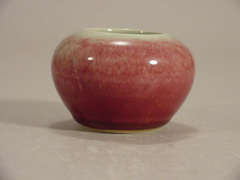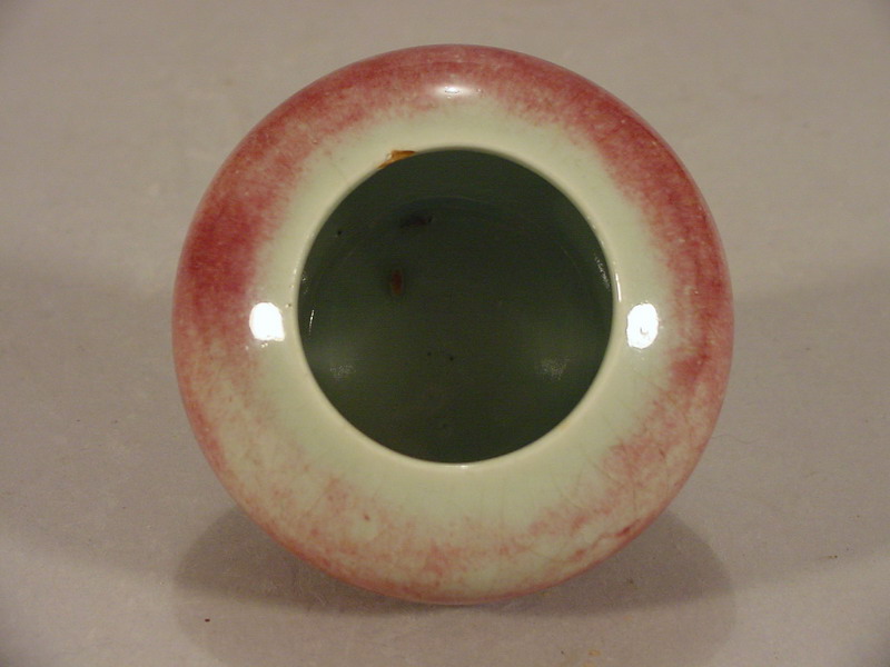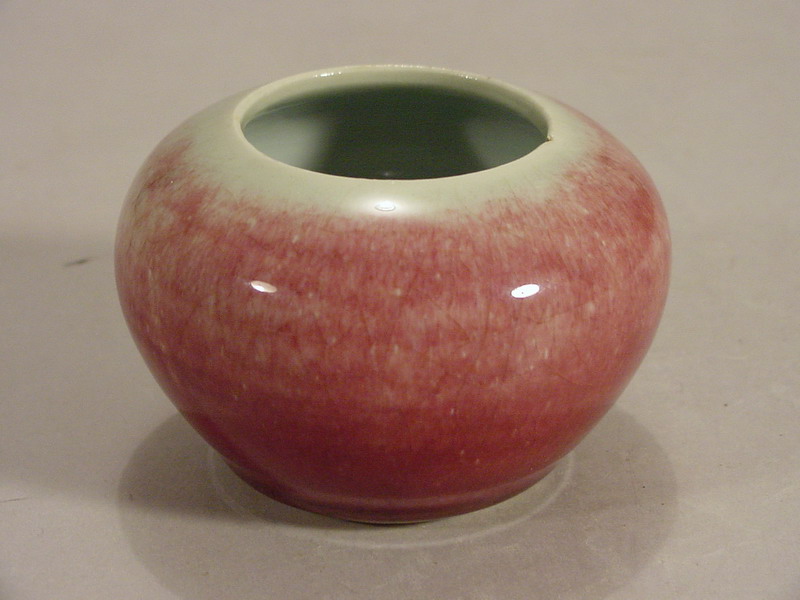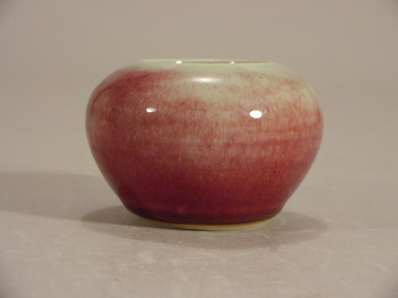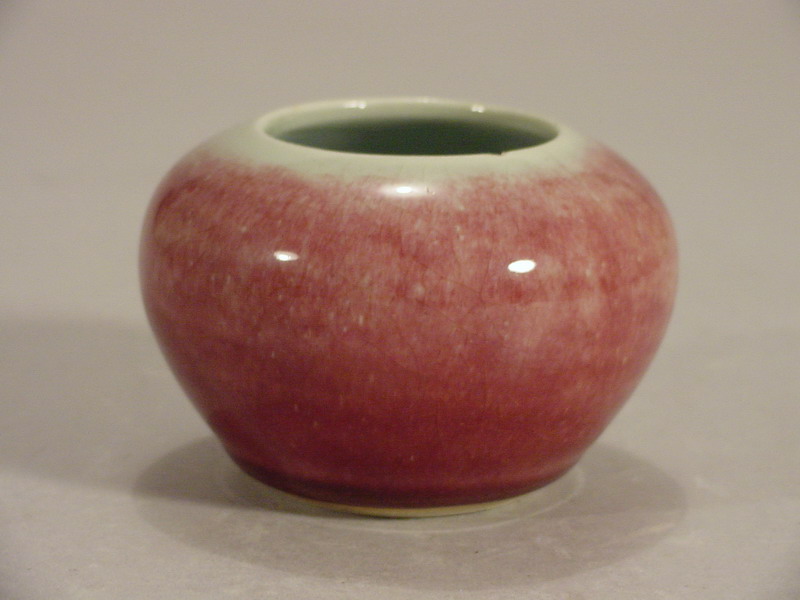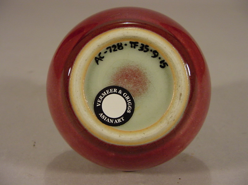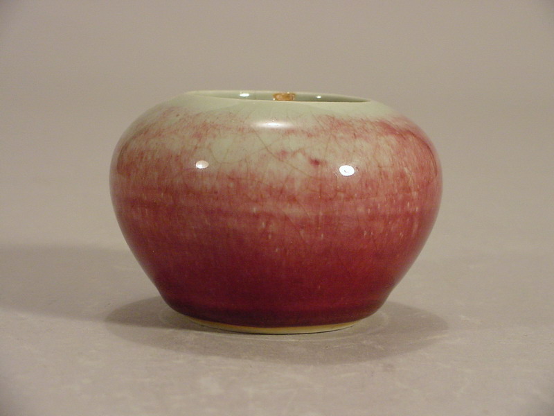body applied with a copper red Langyao glaze that has fired to a pale tone except at