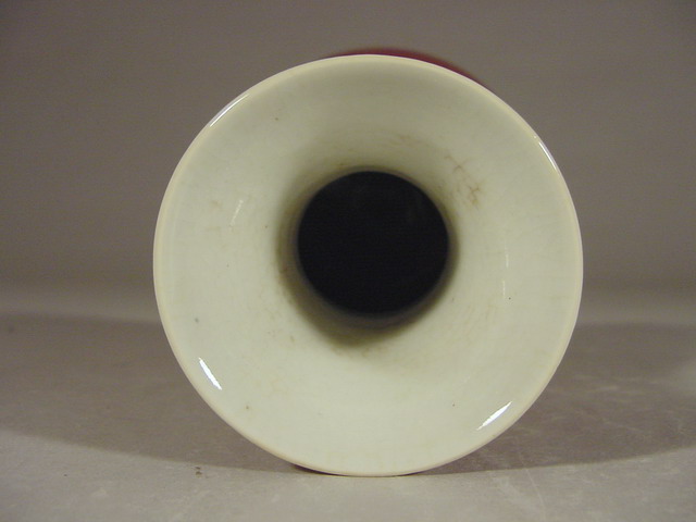 exposing a white rim and darkening at the foot where the glaze stops above the