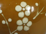 pale toffee brown-toned glaze over which a white slip decoration of a bird on a