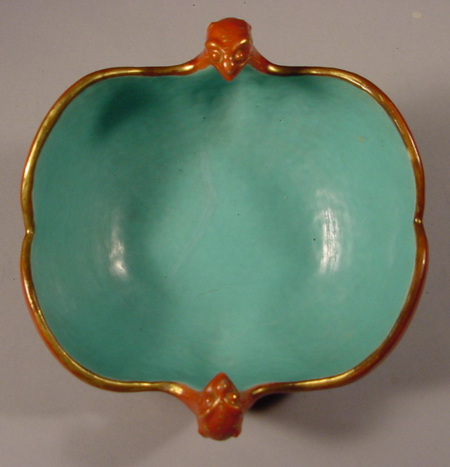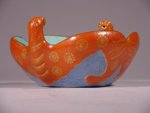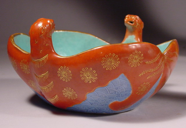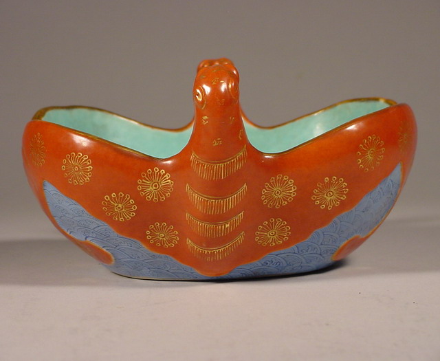 modeled as two opposing bats with outstretched wings painted in iron red enamel (tie hong
