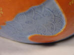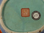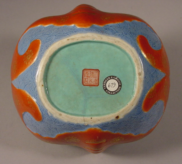 or fan hong) with gilt details on a blue wave ground. The interior and bottom are painted with a "European green" enamel. On the base in zhuanshu script