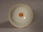 borders. In the interior of the cup is a single peach. The hollow stem is glazed white. This overglaze