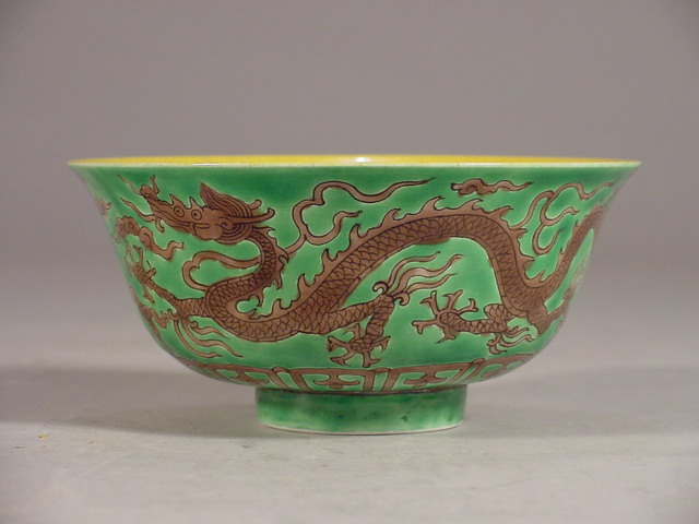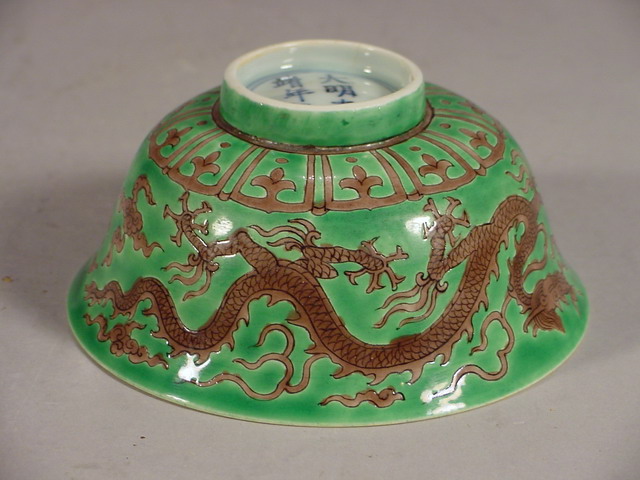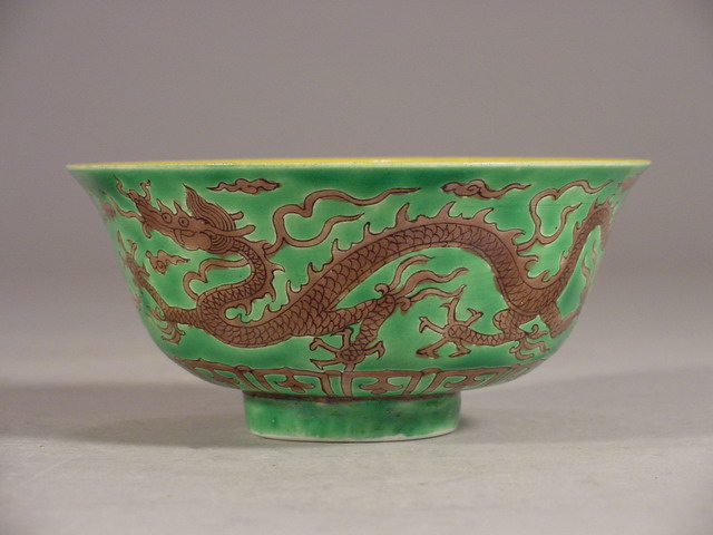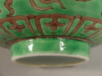 and raised on a high ring foot covered in an emerald green glaze and painted