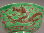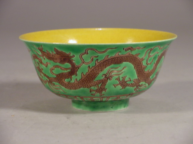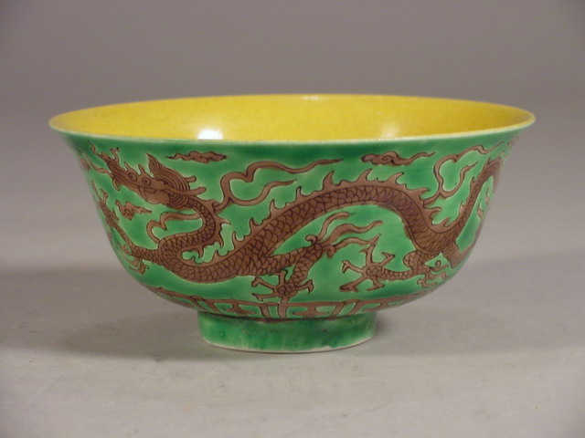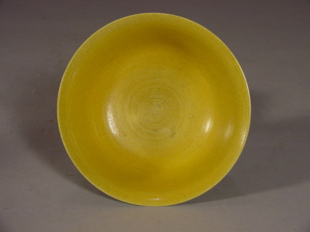 amongst fiery clouds above a ruyi lappet border. The interior is glazed in a rich egg yolk yellow