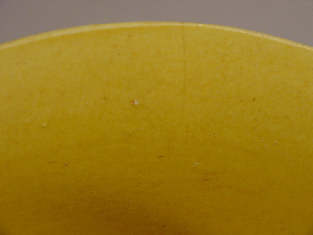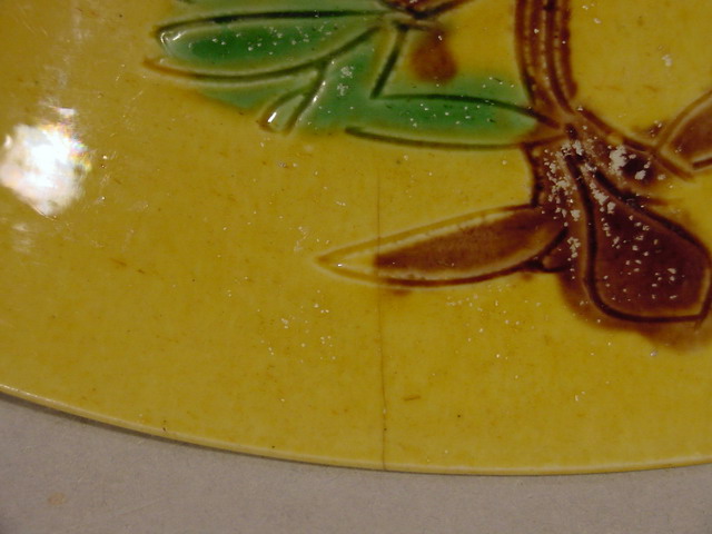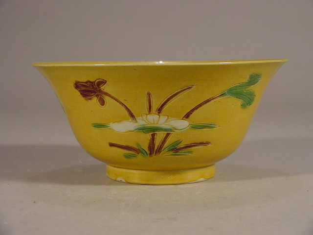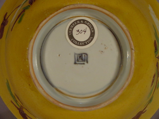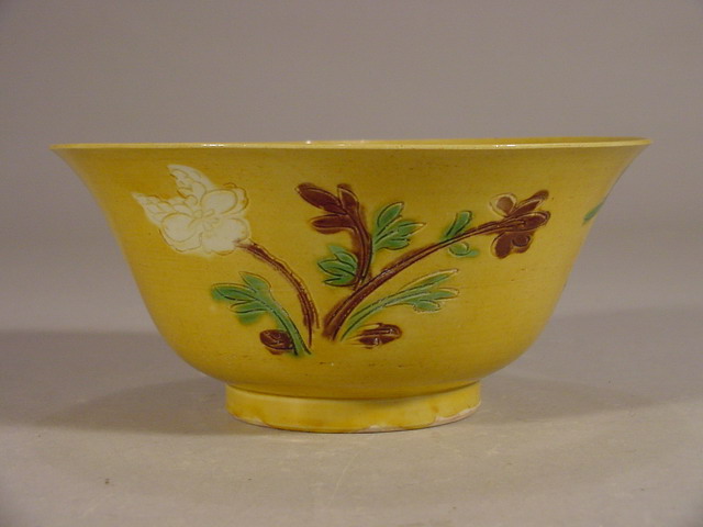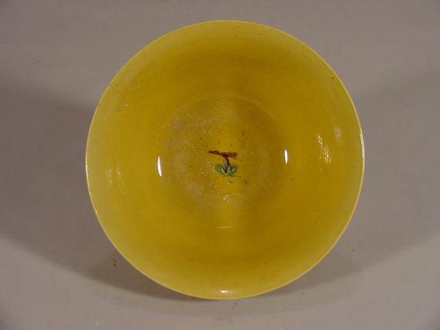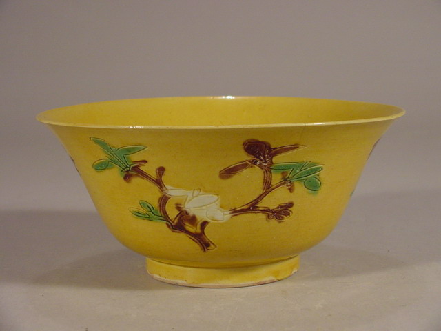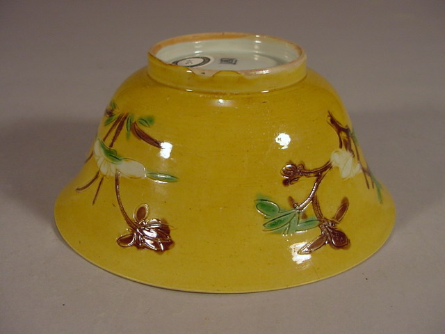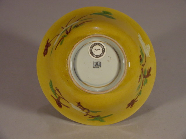 prunus, incised into the paste and painted in enamels of aubergine and green on an egg yolk yellow ground.