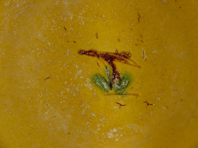 On the interior is a green enameled sprig. These thinly-potted bowls having