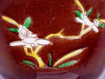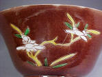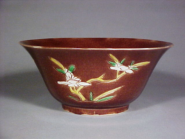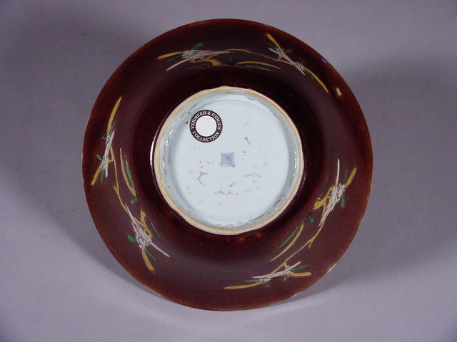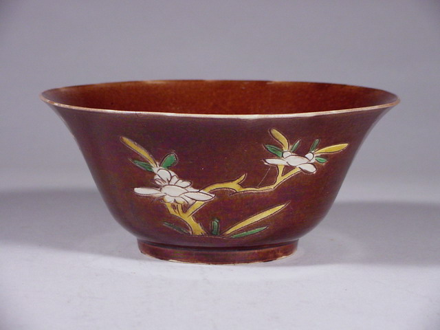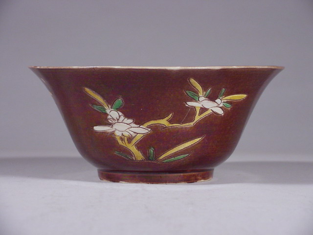 foot decorated with three incised chrysanthemum sprays in green and yellow enamels on an aubergine ground.