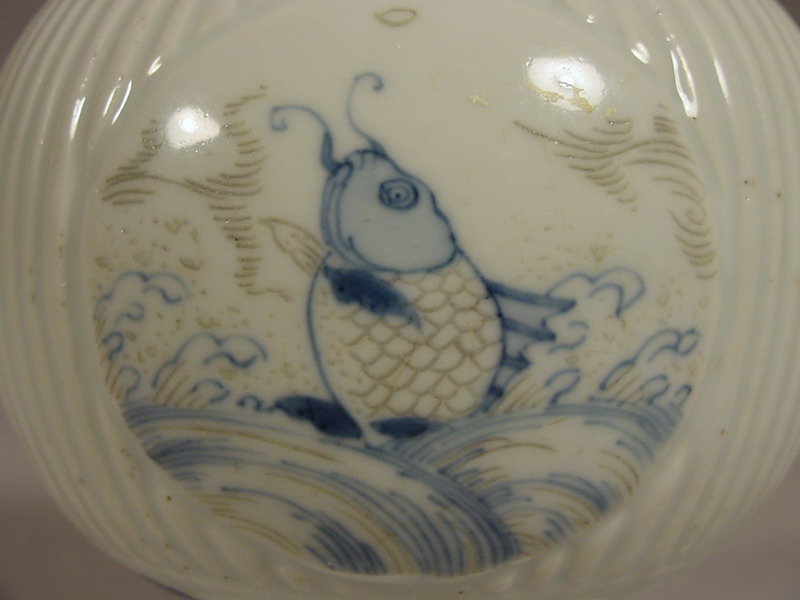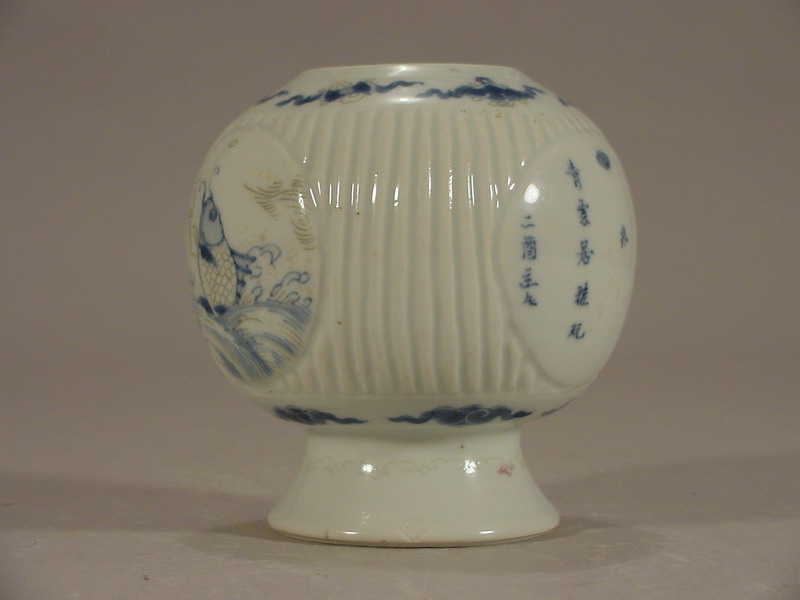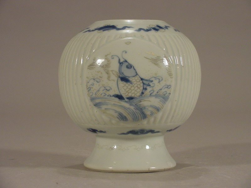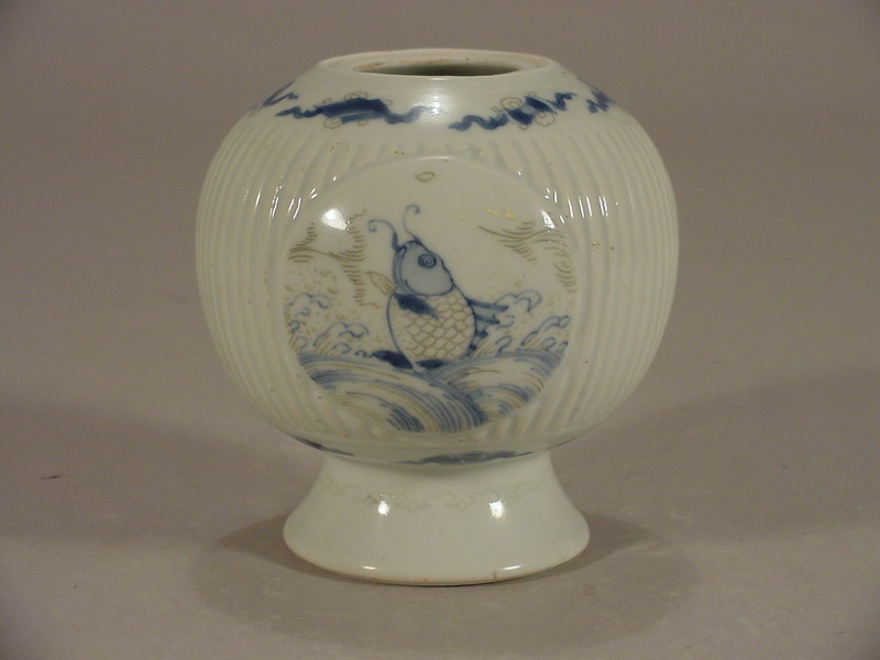 medallions portraying a leaping carp, various porcelain vases, and an