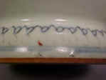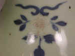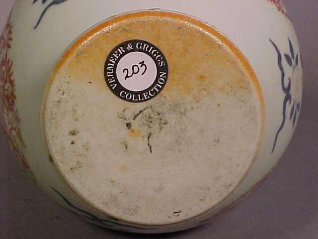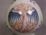 in underglaze blue and red over a fine porcelain body. The flat base is